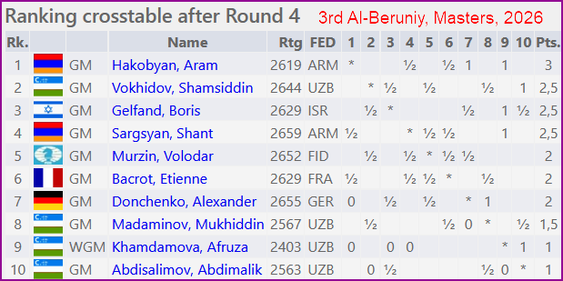 В Ташкенте на фестивале 3rd Al-Beruniy в главном турнире Мастерс после четырёх туров лидирует А.Акопян (Армения, 2619), набравший 3 очка. Израильтянин Борис Гельфанд (2629) победил Афрузу Хамдамову (Узбекистан, 2403) и набрал 2,5 очка.