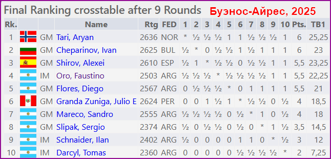 Начнём таки с классики. В Буэнос-Айресе завершился круговой турнир с участием десяти шахматистов. По 6 очков из 9 набрали Арьян Тари (Норвегия, 2636) - первый по дополнительным показателям, и Иван Чепаринов (Болгария, 2625). На 0,5 очка отстали двенадцатилетний Ф.Оро (Аргентина, 2503) и А.Широв (Испания, 2610). Фактически юный аргентинский вундеркинд стал гроссмейстером.