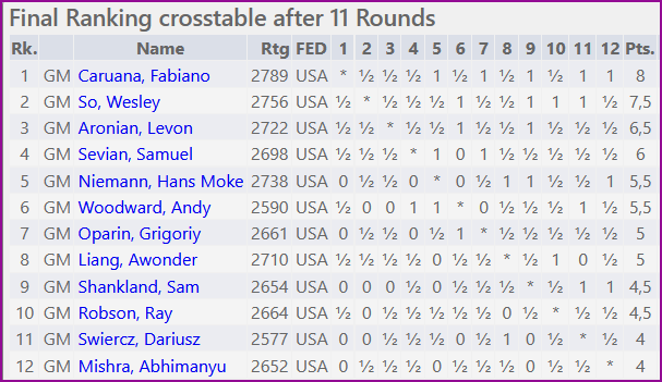 Чемпионат США, завершившийся вчера поздно вечером по европейскому времени, был главным индивидуальным турниром последних двух недель. Упорная борьба у мужчин завершилась победой Фабиано Каруаны, набравшего 8 очков из 11. На 0,5 очка отстал Уэсли Со, ещё на очко меньше и третье место у Левона Ароняна. Примечательно, что все трое не проиграли ни одной партии, хотя турнир оказался достаточно результативным.