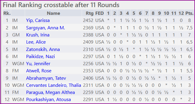 В женском турнир борьба была ещё более непредсказуемой. Большую часть турнира первую позицию занимали несколько шахматисток, а то и три сразу. Тем не менее на финишной прямой всех обогнала Карисса Йип, которая, как и Ф.Каруана, набрала 8 очков. На 0,5 очка отстав достаточно неожиданно заняв второе место вышла Анна Саргсян, на третьем месте опытнейшая Ирина Круш - 7 очков.