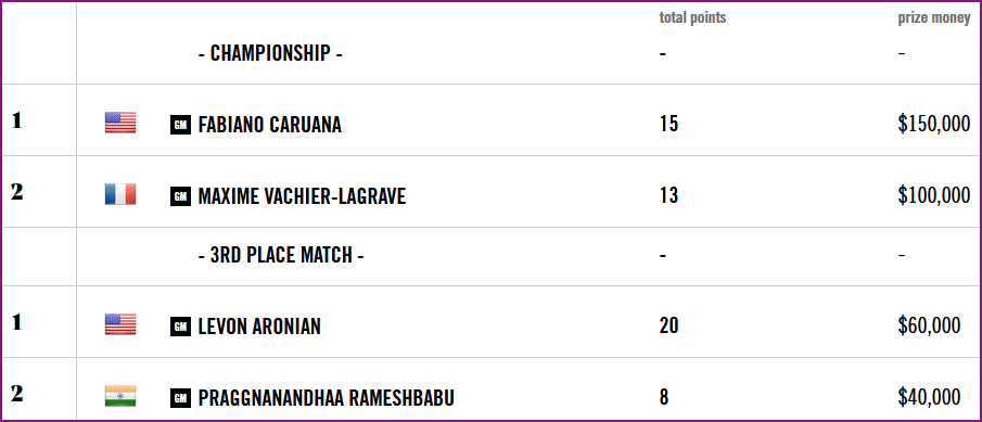Главное событие уходящей недели проходило в далёкой Бразилии - заключительный финальный этап серии Grand Chess Tour - 2025 с призовым фондом 350 тыс. долларов. В Сан-Паулу играло четыре шахматиста, вышедших в финальный турнир по результатам турниров серии: Ф.Каруана, М.Вашье-Лаграв, Л.Аронян и Р.Праггнанандаа. Финальная часть проходила по нокаут системе, а каждый матч по схеме шахматного триатлона состоял из двух классических партий, двух партий в рапид и четырёх партий в блиц с зачётом очков за победу соответственно 6, 4 и 2. Сразу можно сказать, что все классические партии завершились вничью и основная борьба шла в рапиде и блице. Итоги турнира есть в моих новостях. Здесь же остаётся поздравить Фабиано Каруану с очередным успехом и представить картинку с заработанными призовыми: