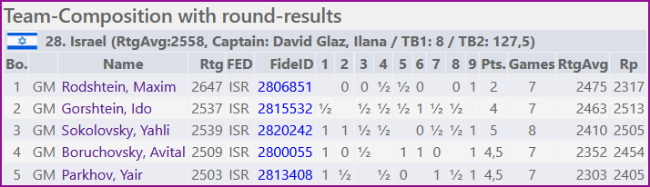 Теперь подробнее о выступлении израильтян. Наша мужская команда заняла 28 место (19 стартовое). Это уже говорит о не удачном выступлении. Ещё один факт - все пять шахматистов понизили свои рейтинги, но особенно провальным выглядит результат нашего лидера М.Родштейна, который потерял сразу 29 пунктов.