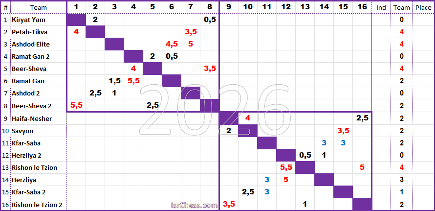 Теперь перенесёмся в Израиль, где стартовал командный чемпионат страны. Как я уже писал раньше, впервые в турнире 16 клубов, разбитых на две подгруппы по восемь команд. В принудительной жеребьёвки города с двумя клубами помещены в одну группу. Так в группе "А" по два клуба из Рамат Гана, Ашдода и Беэр-Шевы, а в группе "В" из Герцлии и Кфар Сабы. Все эти дерби прошли во втором туре, в котором первые команды с большим счётом победили вторые, но исключением стал матч команд из Кфар-Сабы, который неожиданно завершился вничью 3:3. По большому счёту этот результат в первых двух турах и был неожиданным - результаты других матчах во многом были предсказуемыми.