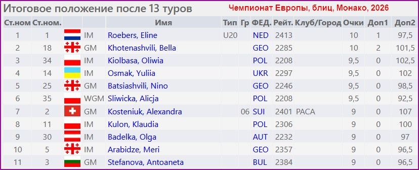 В Монако женский чемпионат Европы по рапиду и блицу. По 10 очков из 13 набрали Элин Руберс (Нидерланды, 2413) - первая по дополнительным показателям, и Белла Хотенашвили (Грузия, 2285). Израильтянки Виктория Черняк (2102) и Арина Березовская (1826) набрали соответственно 7,5 и 6 очков.