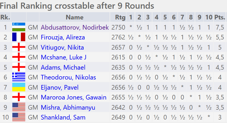 В Лондоне завершился супер-турнир Markets London Chess Classic. В гордом одиночестве уверенную победу в турнир одержал Нодирбек Абдусатторов (Узбекистан, 2750) 7,5 очков из 9. Он на 2 очка опередил А.Фирузджу (Франция, 2762).