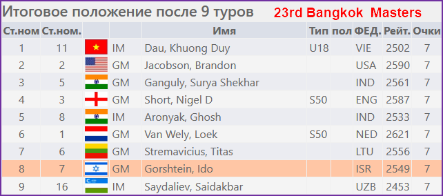 Ещё несколько турниров в которых выступали израильтяне. В Бангкоке прошёл открытый турнир Masters. Сразу девять участников набрали по 7 очков из 9. По дополнительным показателям первым стал Дау Кхыонг Зуй (Вьетнам, 2502), восьмым - израильтянин Идо Горштейн (2549). Ещё один израильтянин Ариэль Эренберг (2496) набрал 6 очков.