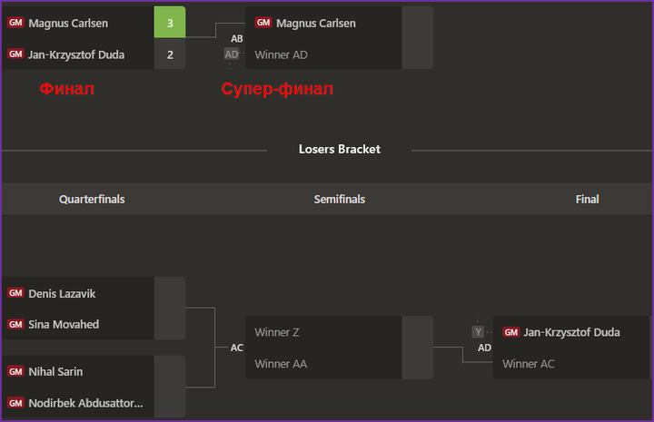 На платформа шахматного игрового портала сhess.com проходит заключительная часть турнира Chess.com Open 2026. Общий призовой фонд турнира 250 тыс. долларов. Турнир проходит с контролем времени 10 мин, по нокаут-системе двойного нокаута. На старт вышло 16 участников. Таблицу главной сетки до финала можно посмотреть во вчерашних новостях. В финале в армагеддоне М.Карлсен победил Я-К.Дуду 3:2. Сегодня в сетке проигравших определится участник супер-финала, который сыграет с М.Карлсеном. Там сначала сыграют Д.Лазавик - С.Мовахед и СНихал - Н.Абдусатторов, затем победители сыграют между собой и далее победитель в этой паре с Я-К.Дудой.