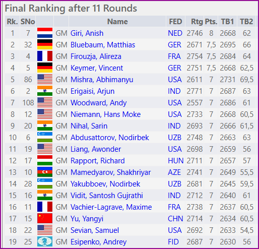 А что же с индусами. Рейтинг-фаворит турнира Р.Прагнанандха, который по ходу турнира победил М.Родштейна, набрал "только" 6 очков и оказался в одной группе со многими другими соотечественниками, включая чемпиона мира Д.Гукеша, а также Я.Непомнящим, А.Грищуком, В Иванчуком... Здесь самым резонансным событием стала серия из трёх поражений подряд действующего чемпиона мира Д.Гукеша, что скорее всего является своеобразным антирекордом для шахматиста в таком статусе. Кроме того, он вылетел из топ-10 шахматистов. Вот результаты шахматистов, набравших 7 и более очков: