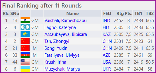 В женском турнире борьба также была упорной, но на финише по 8 очков набрали Рамешбабу Вайшали и К.Лагно. Обе по большей части лидировали по ходу всего турнира. Отмечу, что индийская шахматистка всё ещё не имеет рейтинг 2500, но её пик результатов впереди, что не скажешь о многих конкурентках. Неожиданно удачный результат показала многократная чемпионка США И.Круш, имевшая только 44 стартовый рейтинг. А вот рейтинг-фаворит А.Музычук неожиданно начала с поражения и на длинной дистанции так и не смогла развить скорость, набрав 6,5 очков.