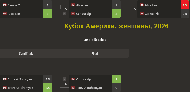 В женском турнире борьба шла ещё упорнее и завершилась матч-реваншем, что случается тогда, когда в супер-финале проигрывает победитель финала главной сетки. Главными действующими лицами здесь были Элис Ли и Карисса Йип. Сначала они встретились в финале главной сетки и Э.Ли выиграла 3:1. В сетке проигравших Карисса Йип победила Татев Абрахамян 2:0 и получила право сыграть в супер-финале, где нанесла поражение Э.Ли 4:3, то есть в армагеддоне! Так как это было первое матчевое поражение Э.Ли она получила право на матч-реванш. Это стал уже третий матч между сильнейшими участницами турнира и на этот раз Э.Ли выиграла 1,5:0,5, став обладателем почётного приза третий раз подряд. Победительница заработала 49 тыс. долларов.