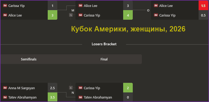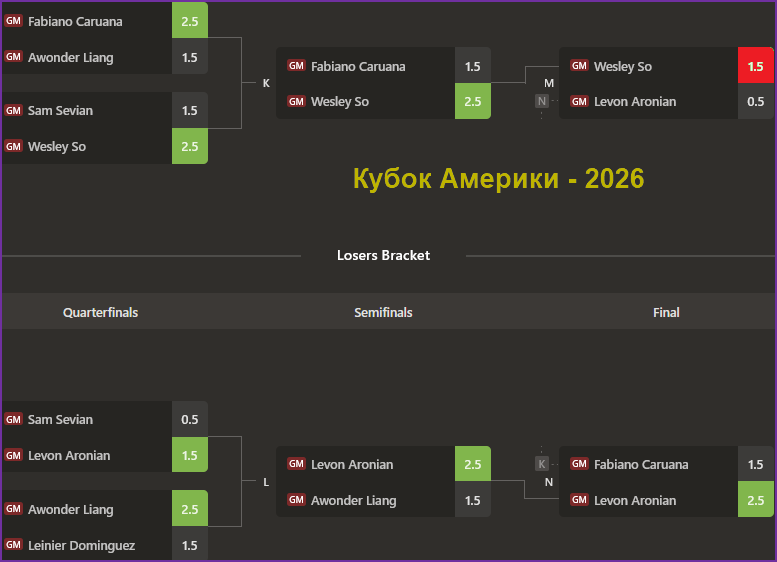 А главное событие проходило в Сент-Луисе - Кубок Америки. В мужском турнире, как обычно, была упорная борьба. Кубковая система всегда интересна и непредсказуема. Л.Аронян проиграл уже в на первом этапе, но затем через сетку проигравших смог добраться до супер-финала. Достаточно редкий случай. В финале главной сетке встречались Ф.Каруана и У.Со, главные фавориты турнира. У.Со победил 2,5:1,5 и отправил рейтинг-фаворита в сетку проигравших. Вот там его снова ждала "засада" в лице Л.Ароняна, который с таким же счётом 2,5:1,5 обыграл грозного соперника. В супер-финале в первой партии У.Со выиграл и вторую партию свёл вничью, став обладателем Кубка и заработав 90 тыс. долларов.