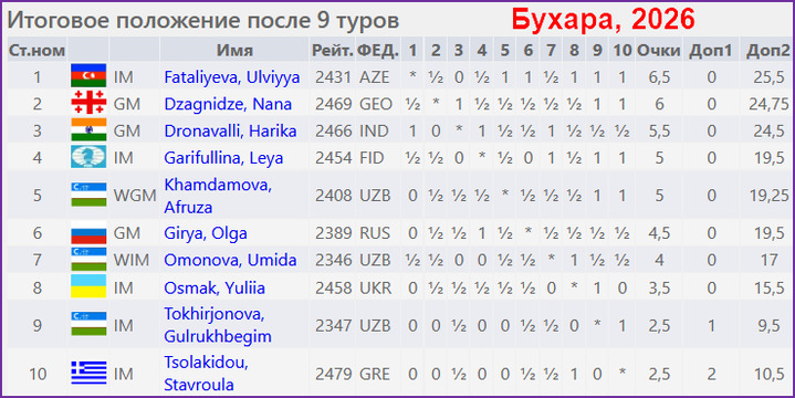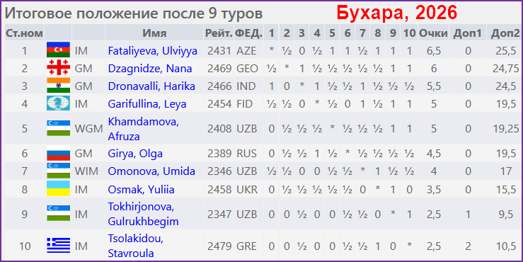 На неделе было много "женских шахмат", но сильнейший турнир в эти минуты завершился в Бухаре - IV Women's Chess Championship. Это круговой турнир с участием десяти шахматисток. Победитель определился только после последнего тура и им стала Ульвия Фаталиева (Азербайджан, 2439), набравшая 6,5 очков из 9. На 0,5 очка отстала Нана Дзагнидзе (Грузия, 2469).