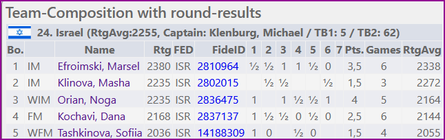 Что касается команды Израиля, то у неё результат чуть лучше, чем у мужчин. По крайней мере израильтянки сделали ничью с сильной командой Армении и проигрывали командам с более высоким рейтингом. Вот как выглядят индивидуальные результаты израильтянок: