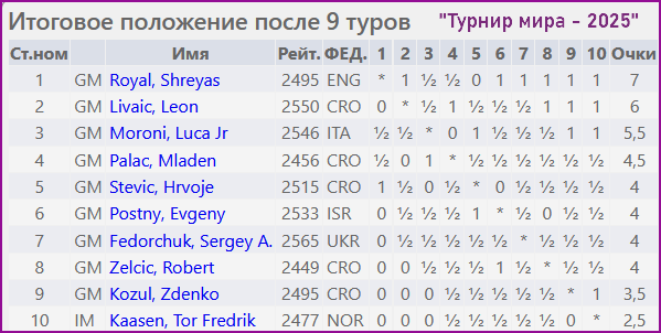 В Загребе завершился "Турнир мира - 2025". Израильский гроссмейстер Евгений Постный (2533) набрал 4 очка из 9.