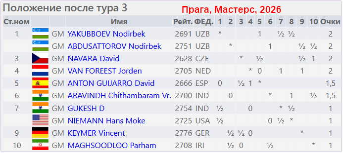 В Праге стартовал шахматный фестиваль с разными турнирами. В сильнейшем круговом турнире выступает десять шахматистов, в том числе чемпион м ира Д.Гукеш (Индия, 2754). После трёх туров впереди Н.Абдусатторов, Н.Якуббоев, Й.Ван Форест и Д.Навара, набравшие по 2 очка.