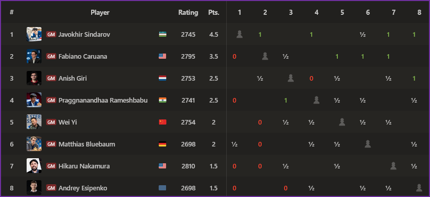 Теперь можно перейти к первому обзору турниров претендентов и претенденток. В турнирах прошло по пять туров из четырнадцати, то есть треть турниров. У мужчин вперёд вырвался Ж.Синдаров, набравший 4,5 очка. Сам результат выглядит феноменально, учитывая статус и значение турнира. Узбекский шахматист продолжает свой для многих неожиданный резкий взлёт, давая понять, что победа в Кубке мира была не случайностью, а закономерностью... Ж.Синдаров уже успел победить Ф.Каруану, который сейчас идёт на второй позиции и до старта турнира входил в число главных претендентов на победу в турнире. А вот второй номер мирового топа Х.Накамура проиграл обоим лидерам и находится в конце турнирной таблицы. Тем не менее пока кого-либо списывать со счетов преждевременно и промежуточные итоги можно будет подвести в следующем обзоре.