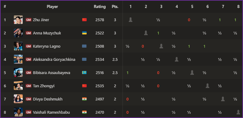 В женском турнире всё происходит значительно спокойнее и без явных лидеров. Достаточно сказать, что в первых двух турах не было результативных партий. Это особенно не характерно для женских турниров. Тем не менее, что есть - то есть.
