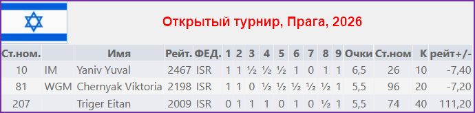 В открытом турнире фестиваля первым стал Кришнан Сашикиран (Индия, 2538), набравший 7 очков из 8. Результаты израильтян: Юваль Янив (2467) набрал 6,5 очков, Эйтан Тригер (2091) и Виктория Черняк (2198) - по 5,5. Вот табличка с результатами израильтян: