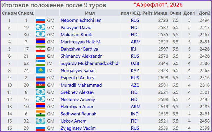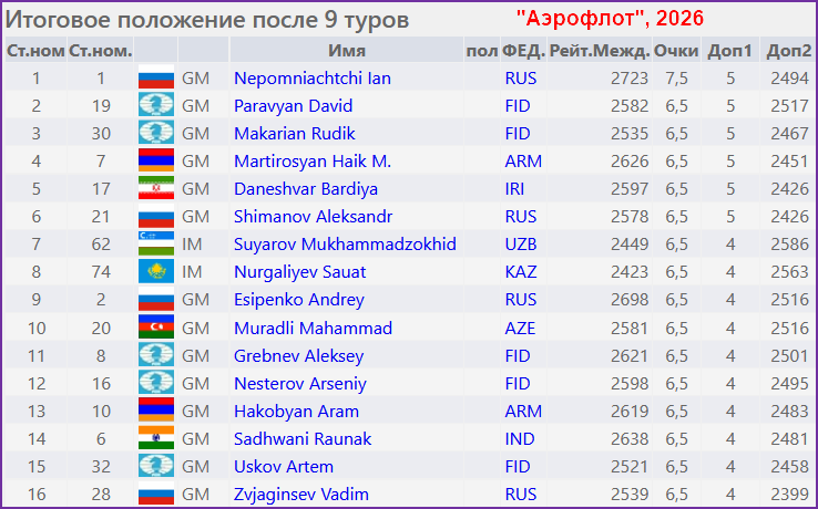 В Москве прошёл фестиваль "Аэрофлот" с крупным открытым турниром с призовым фондом 20 млн. рублей. Явный фаворит турнира Ян Непомнящий уверенно выиграл турнир, набрав 7,5 очков из 9. Он на очко опередил группу из 15 шахматистов.