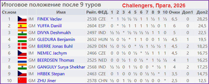 Там же в турнире Challengers первым стал Вацлав Финек, набравший 6,5 очков. На 0,5 очка отстал Д.Юффа, на полтора - индуска Д.Дивья, имевшая девятый рейтинг среди участников.