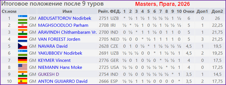 Для любителей шахмат уходящая неделя была весьма насыщенной. Начнём с Праги, где в пятницу завершился крупный традиционный фестиваль с несколькими турнирами. В сильнейшем турнире Masters решающими стали последние туры. Так, Й.Ван Форест, который лидировал большую часть турнира, проиграл две последние партии. В итоге его опередил Нодирбек Абдусатторов, набравший 6,5 очков. На очко отстали П.Магсудлу, Ч.Аравинд и Й.Ван Форест.