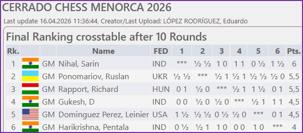 Чемпион мира Д.Гукеш тем временем играл в круговом турнире в Сьюдадела-де-Менорка. Ничем себя не проявил, в борьбе за первое место не участвовал... Похожая история на Дин Лижэня, предыдущего чемпиона мира, о котором сейчас мы уже почти ничего не слышим.