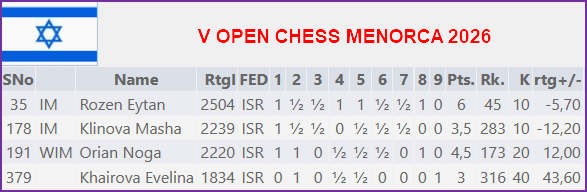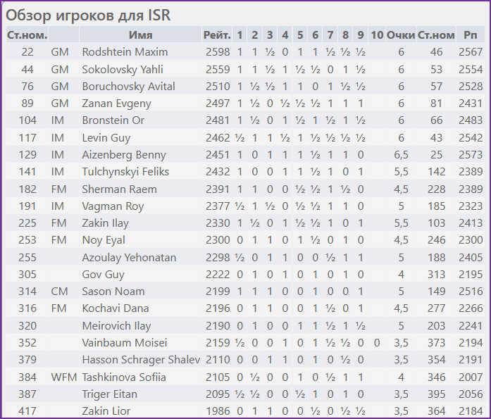 Как можно увидеть, израильтян нет в первой двадцатке, а значит никто из них не принимает участие в борьбе за призовое место. В общем, никаких супер результатов у наших шахматистов нет, да и вряд ли на них можно было рассчитывать.