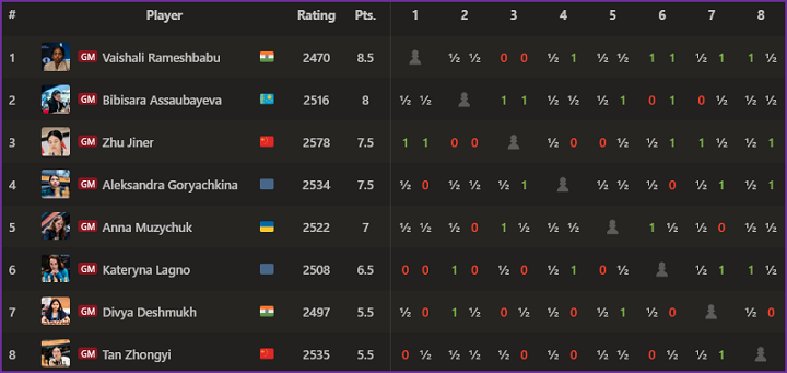 Женский турнир был значительно драматичней и претендентка определилась только на финишной прямой. Ей стала Рамешбабу Вайшали - известная индийская шахматистка, которой до сих пор нет в женском топ-10. Турнир она начала неудачно, оказавшись в конце турнирной таблицы, но несколько побед подряд переместили её вверх, где она продолжала бороться со своими соперницами за победу в турнире до самого конца.