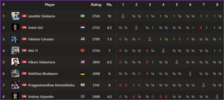 Много турниров хороших и разных... Прошедшая неделя дала нам новых претендентов на звание чемпиона мира среди мужчин и женщин. Впрочем, о том, что Ж.Синдаров выиграет мужской турнир было понятно за долго до его окончания. И главное, что это поняли его соперники - уж больно большой для подобного турнира был отрыв. В итоге отрыв победителя от занявшего второе место А.Гири составил 1,5 очка. Можно сказать, что "старшее" поколение - по отношению к двадцатилетнему Ж.Синдарову - оказалось на вторых ролях. Если учесть, что нынешний чемпион мира Д.Гукеш стал чемпионом мира в 18 лет становится понятна тенденция.