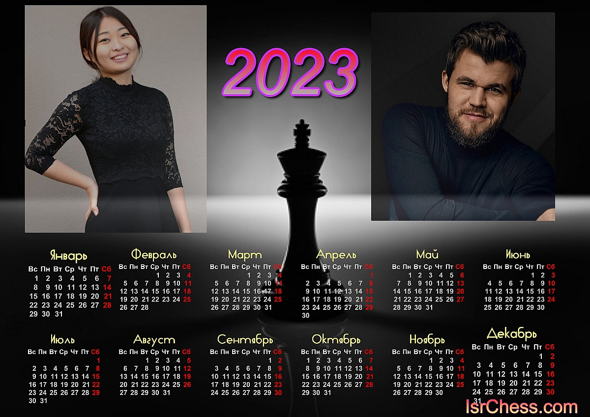 Шахматный календарь 2023 года с фотографиями чемпионов мира Магнуса Карлсена и Цзюй Вэньцзюнь.