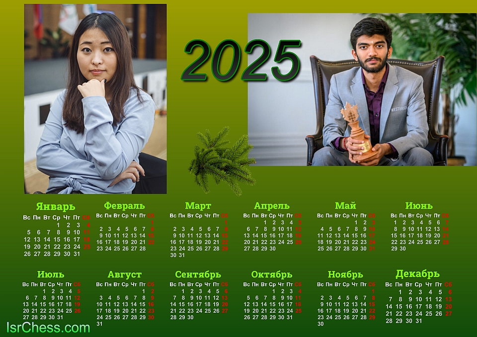Шахматный календарь 2025 года с фотографиями претендента на корону Гукеша Доммараджу и чемпионки мира Цзюй Вэньцзюнь.