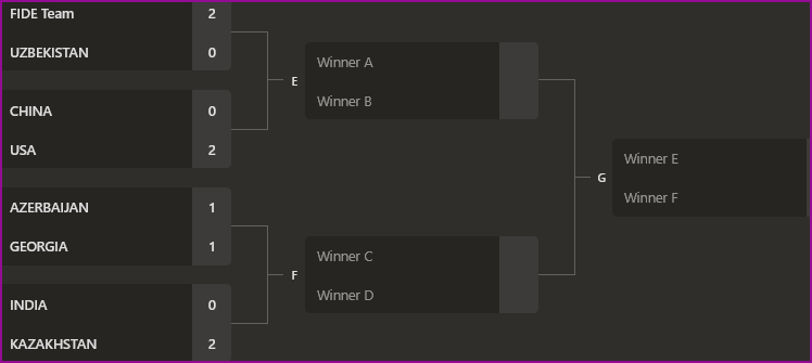 В Линаресе в командном чемпионате мира среди женщин начался второй этап, который проходит по нокаут-системе. В первых партиях ФИДЕ победила Узбекистан 3,5:0,5, США - Китай и Казахстан - Индию 3:1, Грузия -Азербайджан сыграли вничью 2:2. Сейчас проходит вторые партии матчей, а затем, в случае равенства очков - тайбрейк.