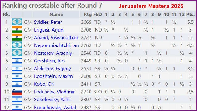 В Иерусалима после двух дней борьбы в Jerusalem Masters продолжает лидировать Пётр Свидлер (ФИДЕ, 2669), набравший 5,5 очков из 7. На 0,5 очка отстают индусы В.Ананд (2727) и А.Эригайси (2708). 4,5 очка набрал Я.Непомнящий (ФИДЕ, 2762). Завтра заключительные четыре тура. Четыре первых продолжат борьбу во втором этапе, которой пройдёт по нокаут-системе.