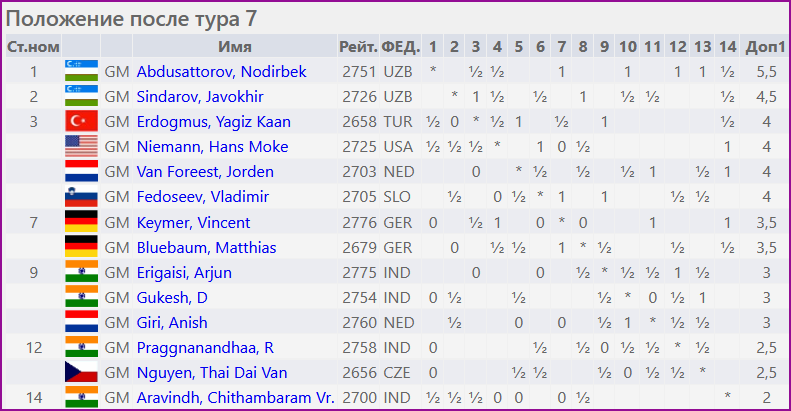 Ж.Синдаров (Узбекистан, 2726) - Х.Ниманн (США, 2725), Р.Праггнанандаа (Индия, 2758) - М.Блюбаум (Германия, 2679) и Нгуен Тхай Вам Дана (Чехия, 2656), В.Федосеев (Словения, 2705) завершились вничью. Вот как выглядит текущая таблица: