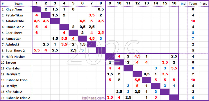 В Израиле прошёл пятый тур командного чемпионата страны в высшей лиге и накануне один матч шестого тура, который завершится остальными матчами завтра. Если в пятом туре обошлось без сюрпризов и лидеры одержали победы, то как раз матч шестого тура оказался весьма неожиданным. В группе В лидер первая команда Ришона проиграла новичку лиги Савиньону 2:4. Ришону это поражение осложнит борьбу за первое место, а у новичка появился шанс зацепиться за четвёртое место в группе и дальше продолжить борьбу с группе сильнейших. В пятом туре впервые в этом чемпионате произошёл "сухой" счёт 6:0, с которым первая команда Беэр-Шевы выиграла у Кирьят Яма.