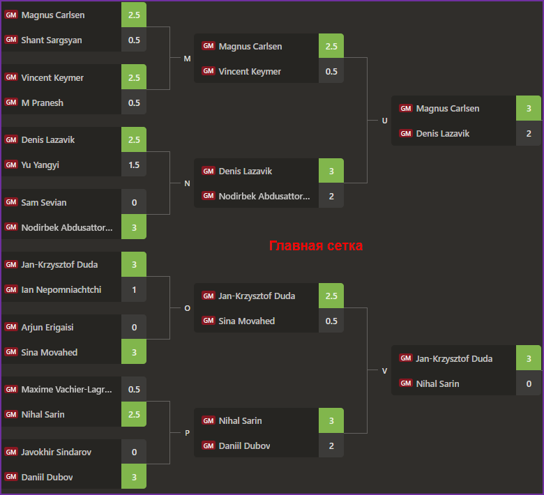 На платформа шахматного игрового портала сhess.com проходит заключительная часть открытого турнира, в котором на старт вышло 16 шахматистов. Турнир проходит с контролем времени 10 мин, по системе двойного нокаута. Несколько интересных моментов: уже в 1/8 финала претендент на шахматную корону Ж.Синдаров проиграл Д.Дубову 0:3, бывший претендент на корону Я.Непомнящий - Я-К. Дуде 1:3. В полуфиналах М.Карлсен в армагеддоне победил Д.Лазавика 3:2, а Я-К. Дуда - С.Нихала 3:0.