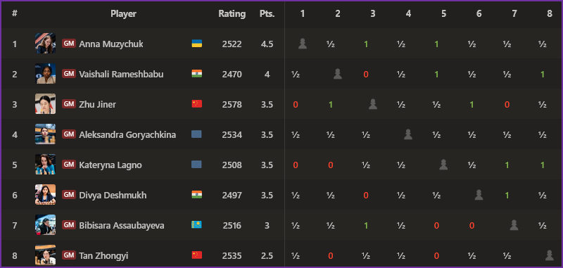 В женском турнире Р.Вайшали (Индия, 2470) победила Тань Чжунъи (Китай, 2535), партии А.Музычук (Украина, 2522) - Б.Асаубаеву (Казахстан, 2516), А.Горячкина (ФИДЕ, 2534) - Чжу Цзиньэр (Китай, 2578), Д.Дивья (Индия, 2497) - Е.Лагно (ФИДЕ, 2508) завершились вничью. Единоличным лидером остаётся А.Музычук, которая выиграла первый круг набрав 4,5 очка.