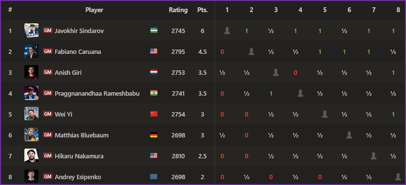 В Пафосе на Кипре в турнире претендентов в седьмом туре Вэй И (Китай, 2754) чёрными победил А.Есипенко (ФИДЕ, 2698), партии Р.Праггнанандаа (Индия, 2741) - Ф.Каруана (США, 2795), М.Блюбаум (Германия, 2698) - Х.Накамура (США, 2810), Ж.Синдаров (Узбекистан, 2745) - А.Гири (Нидерланды, 2753) завершились вничью. Лидирует Ж.Синдаров, набравший 6 очков.