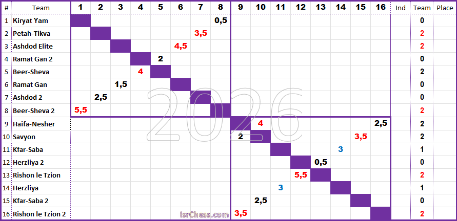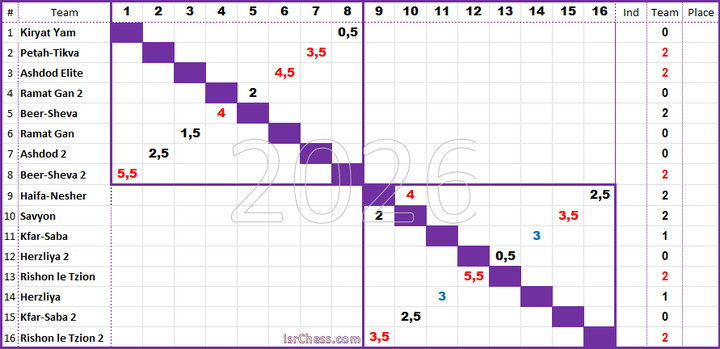 В Израиле стартовал командный чемпионат в высшей лиге, который впервые проходит при 16 командах, разбитых на две подгруппы по восемь команд. Стартовые матчи прошли без сюрпризов. Завтра второй тур (один матч второго тура уже сыгран).