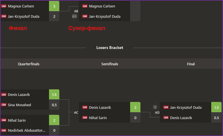 На платформа шахматного игрового портала сhess.com вчера поздно вечером в финале главной сетки М.Карлсен в армагеддоне победил Я-К. Дуду 3:2. Сегодня в нижней сетке проигравших Д.Лазавик победил С.Нихала 2:0, но проиграл Я-К. Дуде 0,5:1,5. Завтра в супер финале сыграют М.Карлсен - Я-К. Дуда.
